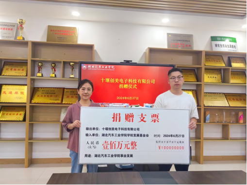 张默代表公司对十堰创美电子科技有限公司的捐赠表示衷心感谢,该公司所展现的社会责任感,不仅为公司的发展注入了动力,也为我们树立了积极的榜样,希望十堰创美电子科技有限公司持续关注和支持公司和公司事业发展。